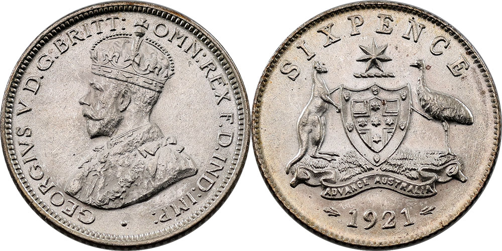 Sixpence. 1921. Orange peel surfaces with...