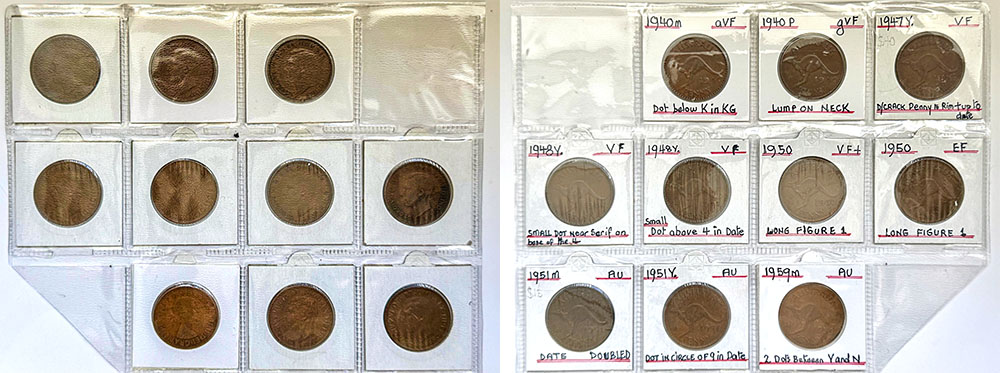 | Description: 1940, 1940 K.G, 1947Y, 1948Y (2), 1950 long 1 (2), 1951 date doubled, 1951Y, 1959. Minor varieties with tiny cuds/dots, die cracks etc. (10 coins total). F-gEF |