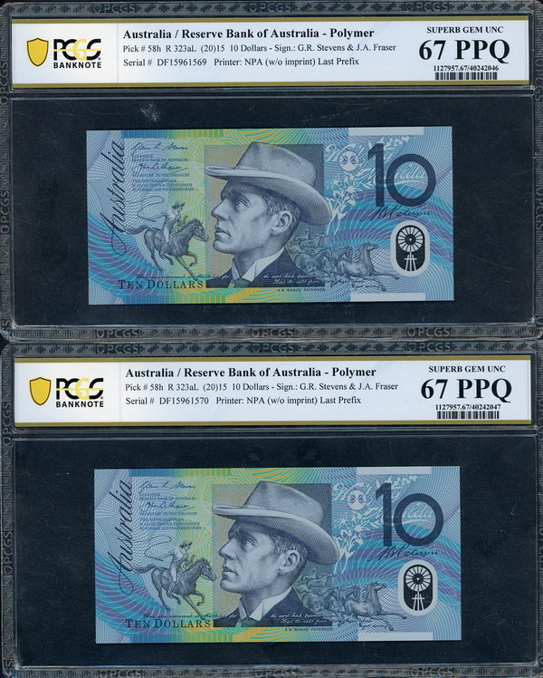 | Description: 2015 polymer Stevens-Fraser DF 15 (R 323aL). Last Signature and Series prefix. Both PCGS graded Superb Gem Unc 67 PPQ (40242046/7). Consecutive pair. |