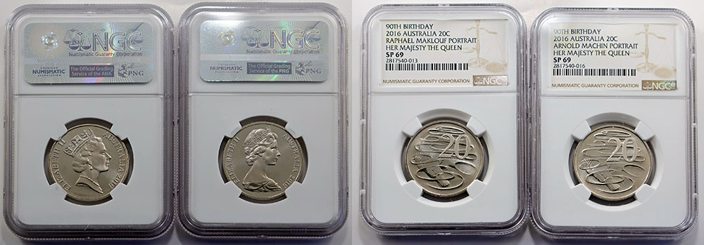 2016 QE II 90th Birthday Machin and Maklouf portraits. Both NGC graded SP 69 (2817540-013, 2817540-016). (2 coins total).