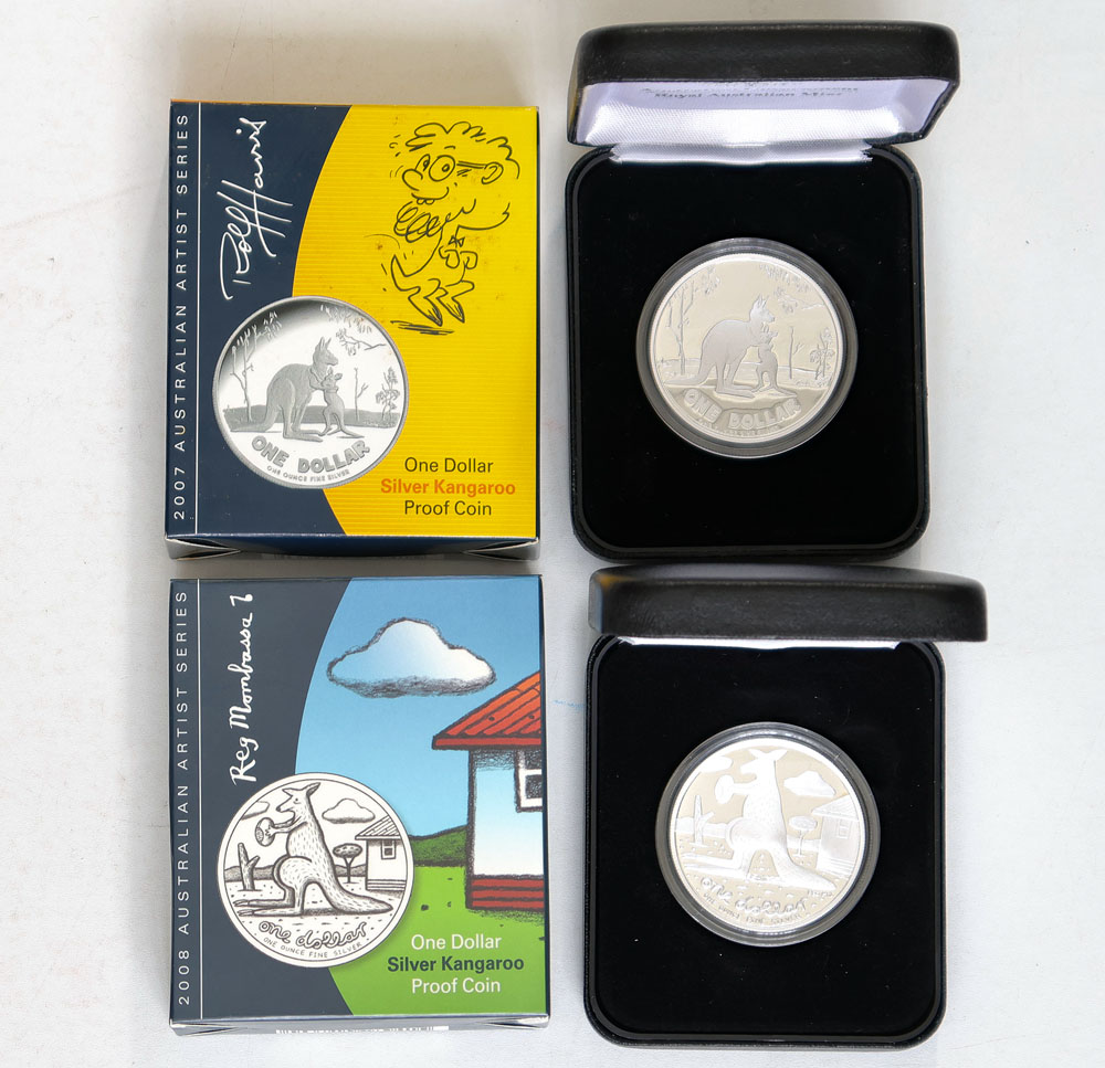 2007, 2008 Artist Series Silver Kangaroo: 2007 Rolf Harris, 2008 Reg Mombassa 1 oz silver Proofs. In boxes of issue with COA. (2 items total).