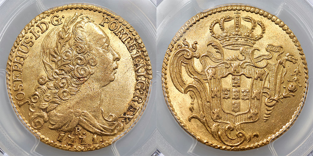 Brazil gold Half Johanna (6400 Reis) 1771R. Joseph I. PCGS graded AU 58 (46591924). Some mint bloom. Scarce.