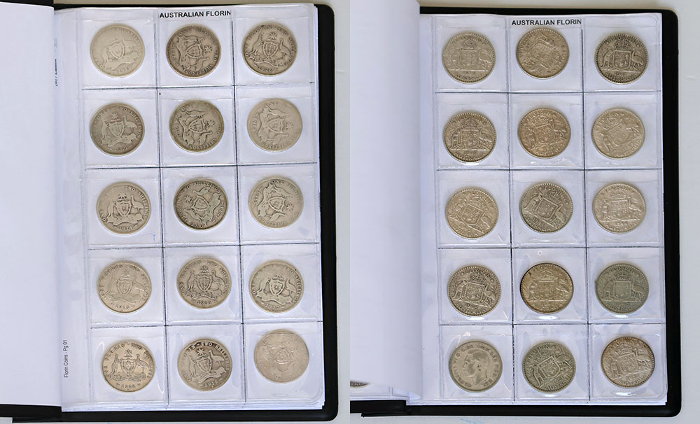 | Description: Florin set 1910 to 1963. Only missing 1934/35 Centenary, 1932 is VG. Includes other commemorative issues and Obverse types, most early dates well-circulated and worn. In coin album. (60 coins total). G-EF |
