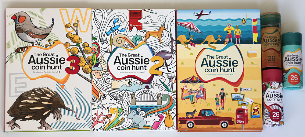 2019, 2021, 2022 Great Aussie Coin Hunt Tubes with corresponding collector folders. Slight damage to folder of first. (3 items total).