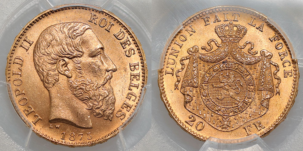 Belgium gold 20 Francs 1875. Leopold II. PCGS graded MS 64 (45328853). Lovely satin lustre. Ex Roxburys S130 (lot 1289).
