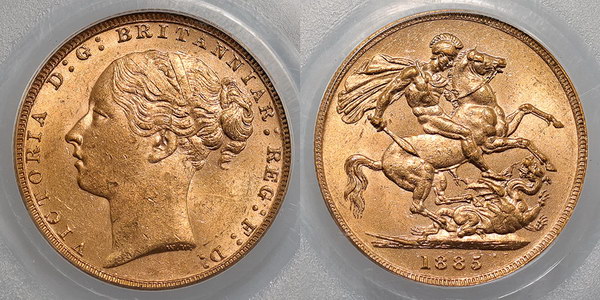 Sovereign Victoria 1885, Young head St George Reverse. PCGS graded MS 62 (10713140). Old tone.
