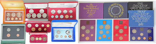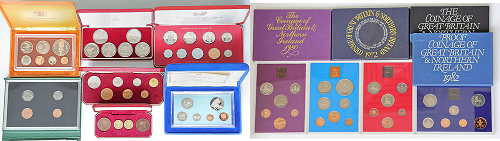 | Description: World Proof sets: Cook Islands 1975, Fiji 1983, Malta 1976, Seychelles 1969, Uganda 1987, 4-coin Proof set Jersey 1964, USSR Olympic 1 Rouble Unc 6-coin set and GB/Nth Ireland Mint sets 1972, 1980, 1981, 1982. In cases of issue, some toned or cases marked. (11 items total). UNC-FDC |