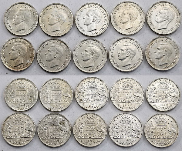 1946 (5), 1947 (5). Some bloom. (10 coins total).