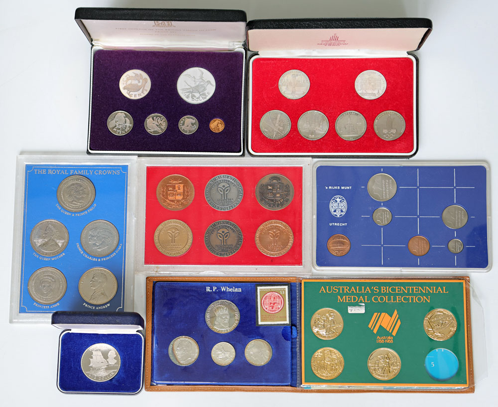 | Description: Austria Vienna University 1965 silver 4-coin Proof set in folder, British Virgin Islands proof set 1973 with silver Dollar, Russia Olympics 1980 6-coin Unc set, GB Royal Family 5-Crown set 1980-84, Netherlands Unc set 1984, New Zealand Proof Dollar 1970, Australia Bicentenary medallion collection 1988 (missing one) and Victoria 150 Years 6-medallion set in perspex. Otherwise all cased. Some tone and marks. (8 items total). UNC-FDC |
