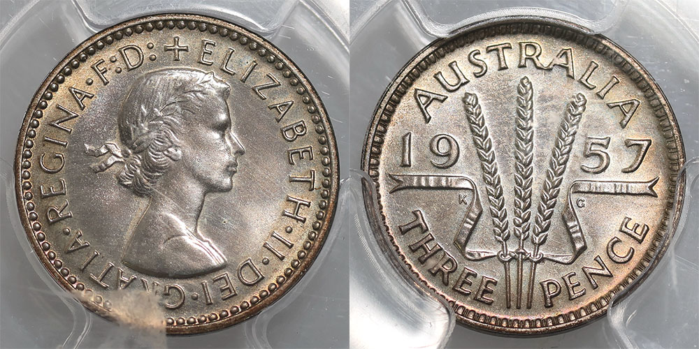 1957 Proof Threepence. PCGS graded PR 64 (20445645). Peripheral tone.