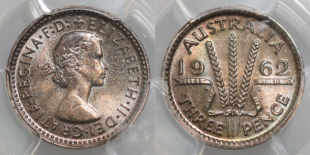 1962 Proof Threepence. PCGS graded PR 66 (28635962). Deep attractive toning with some rainbow colourings.