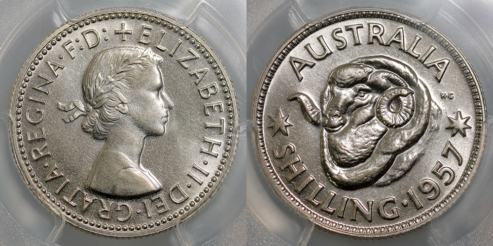 1957 Proof Shilling. PCGS graded PR 65 (37646001). Bright bloom.