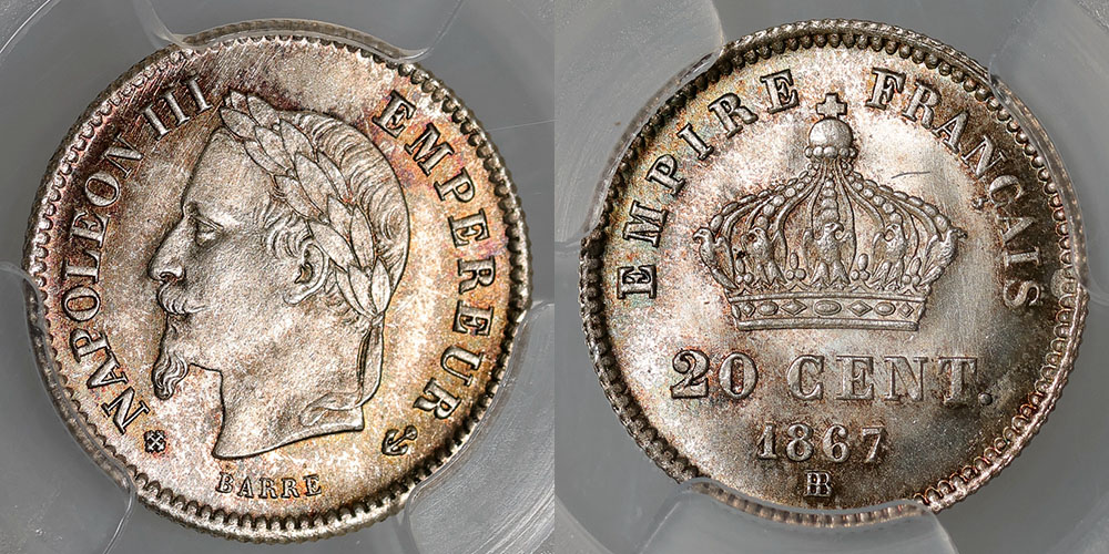 France 20 Centimes 1867BB. PCGS graded MS 66 (39285460). Attractive toning with bright mint bloom.