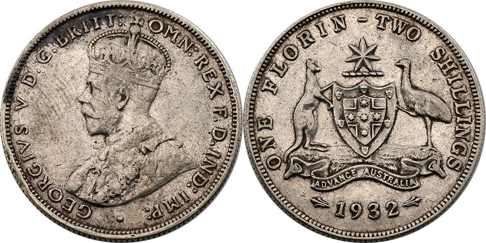 Florin. 1932. Key date. Toned.
