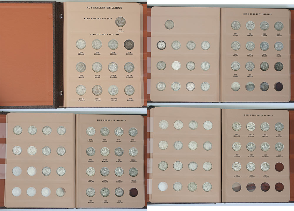 | Description: Shilling set 1910-1963, complete. An overall decent set, with key date 1921 star and 1933 in G-VG, some better later dates. In Dansco porthole album. (49 coins total). GOOD-UNC |