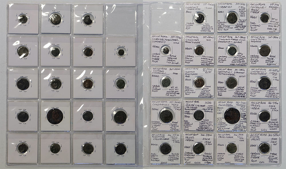| Description: Ancient Roman bronze minors (337-364 AD); Constantius II, Julian II, Jovian, Valens emperors, various mints (10-26mm). Lightly oiled, one holed, some pitted and one broken. (19 coins total). POOR-gFINE |
