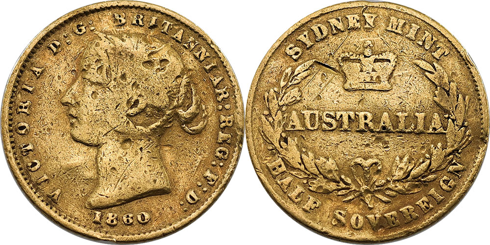 1860 Sydney Mint, Type II. Victoria Young head. Dented