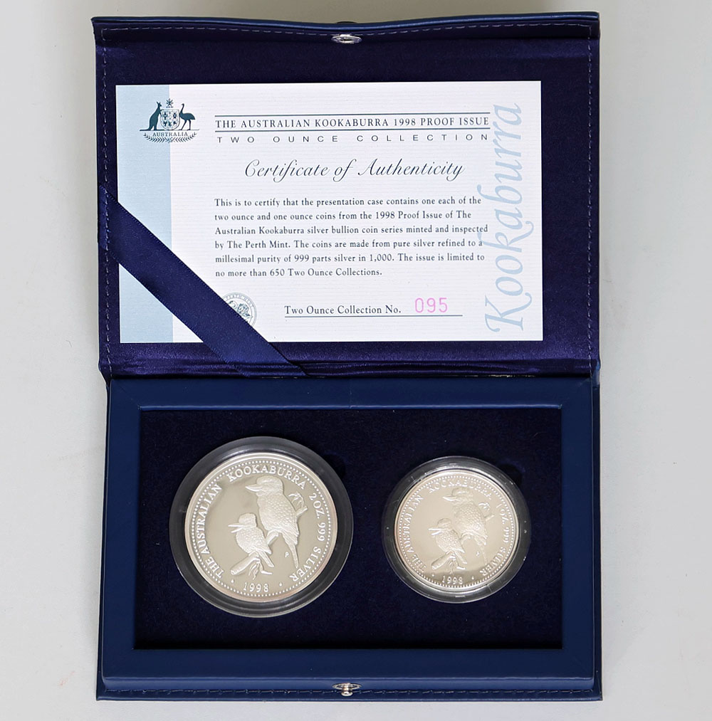 1998 Australian Kookaburra 2-coin set of a 2 oz and 1 oz silver Proof. In case of issue with COA. Light peripheral tone.