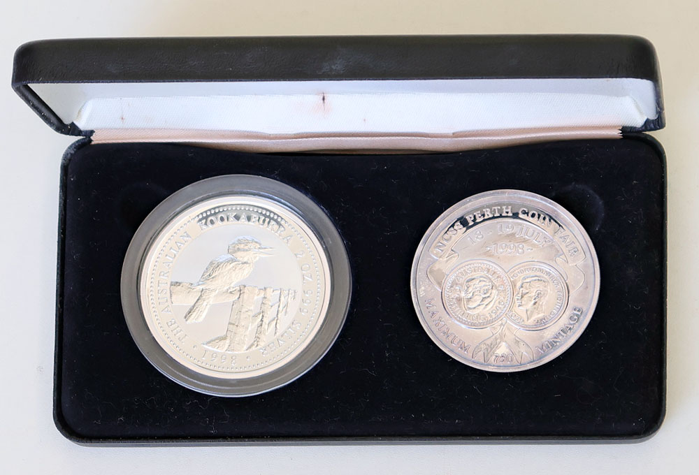 | Description: 1998 Australian Kookaburra 2 oz silver Specimen coin and 2 oz silver Unc medallion. NCSS Coin Fair issue, July 1998. In case of issue with COA. Medallion toned and case with minor marks. UNC |