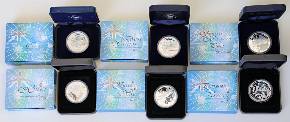 | Description: 2004-12 Australian Antarctic Territory coloured 1 oz silver Proofs: 2004 Mawson Station, 2007 Davis Station (minor marks to box), 2009 South Magnetic Pole, 2010 Husky, 2011 Killer Whale, 2012 Emperor Penguin. In boxes of issue with COAs. (6 items total). FDC |