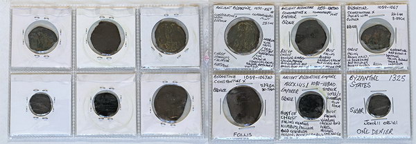 | Description: Ancient Byzantine Empire Constantine X copper Follis (approx 28mm, 1059-1067 AD) (4), Alexius I copper minor (11mm, 1081-1118 AD) and John II Orsini copper Denier (17mm, 1325 AD). (6 coins total). POOR-FINE |