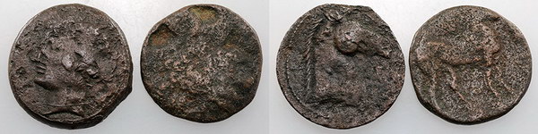 Ancient Carthage bronze Dishekel, second Punic War (26mm, 300-264 BC) and unknown Tanit/horse issue (27mm, 250 BC). (2 coins total).