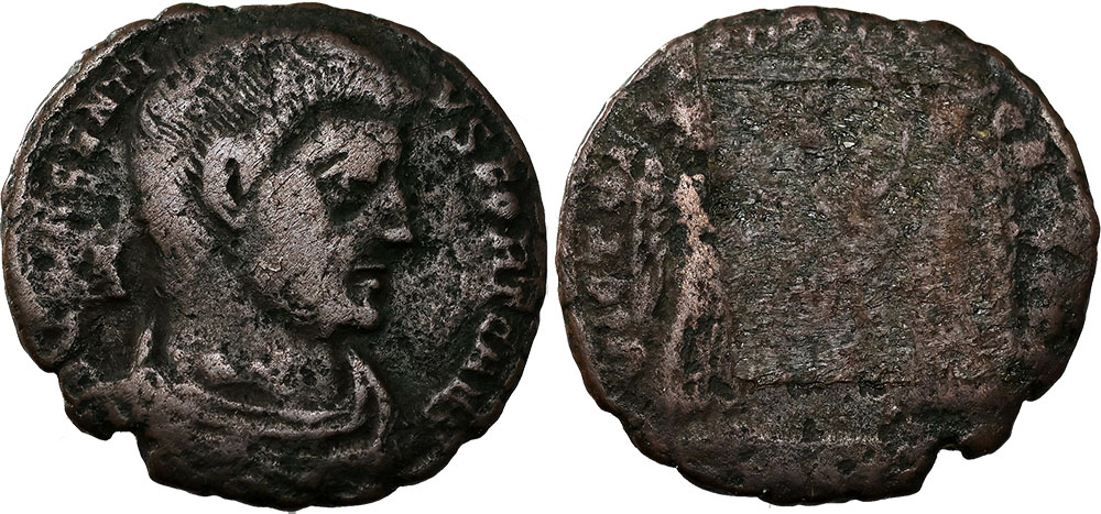 Ancient Roman Imperial bronze Magnus Decentius as Caesar (23mm, 350-353 AD). Obv: bust Dalmatius right, Rev: two Victories placing shield on pedestal.