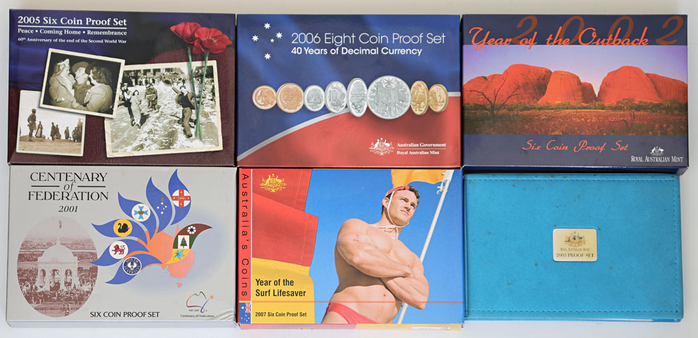 2001, 2002, 2003 (no box), 2005, 2006, 2007 Proof sets. Minor marks. (6 items total).