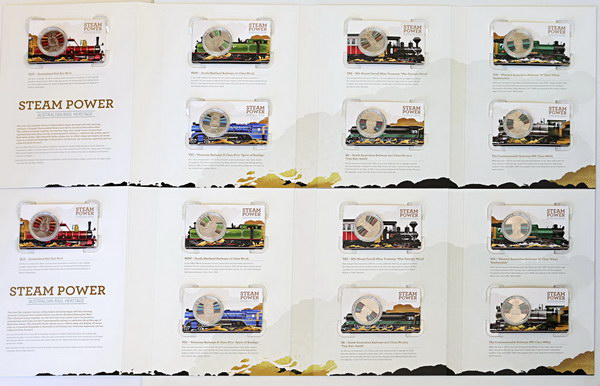 2022 Steam Power 7-coin collection of coloured Unc 50 Cent coins on cards in official RAM folders. In cardboard shippers. (2 sets total).
