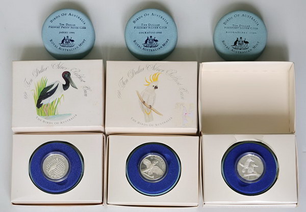 1989-1991 Birds of Australia $10 silver Piedfort Proof set of 3. In boxes of issue, some marks. (3 items total).
