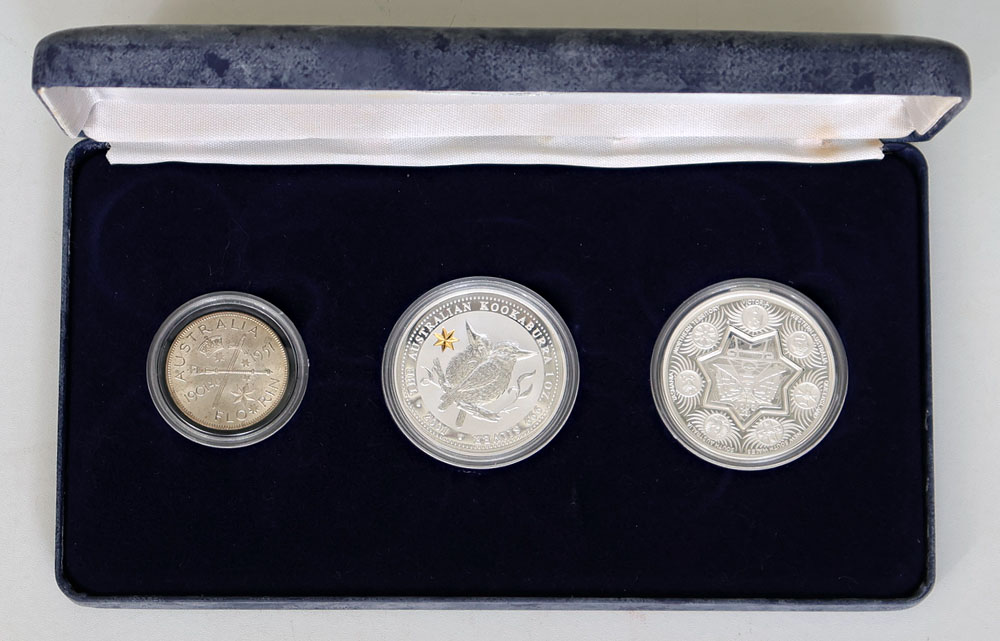 | Description: 2001 Federation Star Collection 3-coin set of 1951 Jubilee Florin, 2001 1 oz silver Proof Kookaburra star privy and 2001 COF Holey Dollar and Dump style 1 oz silver Proof. In single case of issue with COA (environmental damage to case). UNC-FDC |
