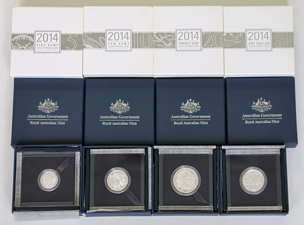 2014 Year silver Proof set of 4; 5 Cent, 10 Cent, 20 Cent and 1 Dollar. All in individual boxes of issue. (4 items total).