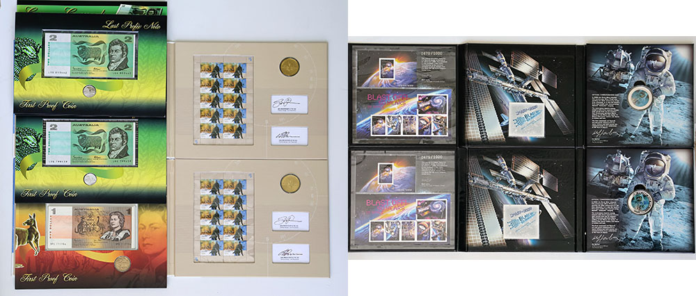 | Description: 2004 Blast Off! 50 Years in Space 1 oz silver Proof lenticular coin and stamp booklet (2), 1 Dollar 1984 Proof coin and Last Prefix DPS note pack, 2 Dollar silver Proof 1988 coin and Last Prefix LQG note pack (2) and Perth Mint 2007 Special Air Services 1 Dollar coin and stamp folio (2). (7 items total). UNC-FDC |