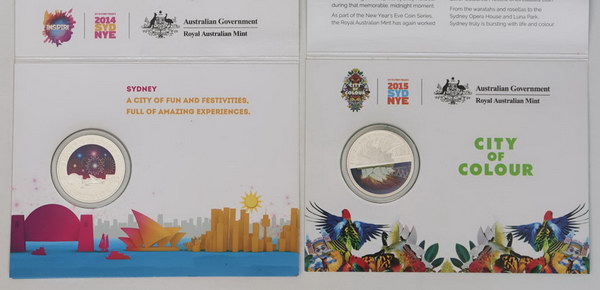 2015, 2016 Sydney New Years Eve 1 oz coloured silver frosted Unc issues. In RAM folders of issue. (2 items total).