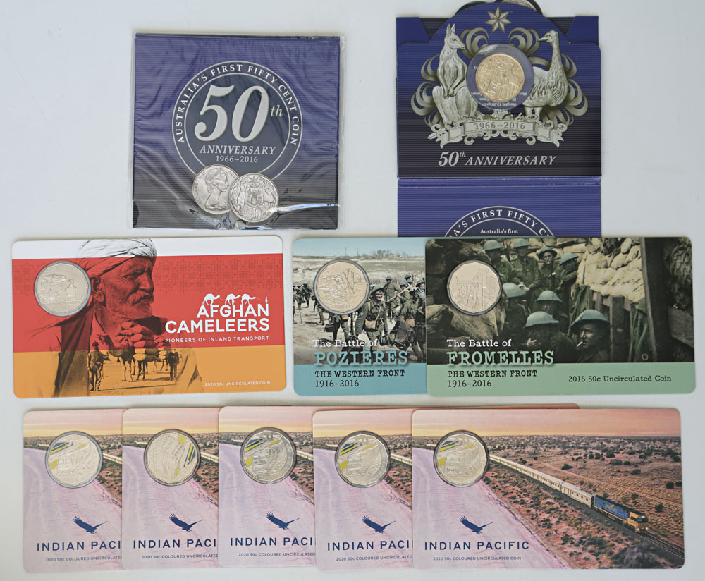 | Description: 2020 Indian Pacific coloured Unc on cards (5), 2020 Afghan Cameleers Unc, 2016 Fromelles Unc, 2016 Pozieres Unc on RAM cards. Also 1966 Round 50 Cents in Downies packs (2). (10 items total). UNC |