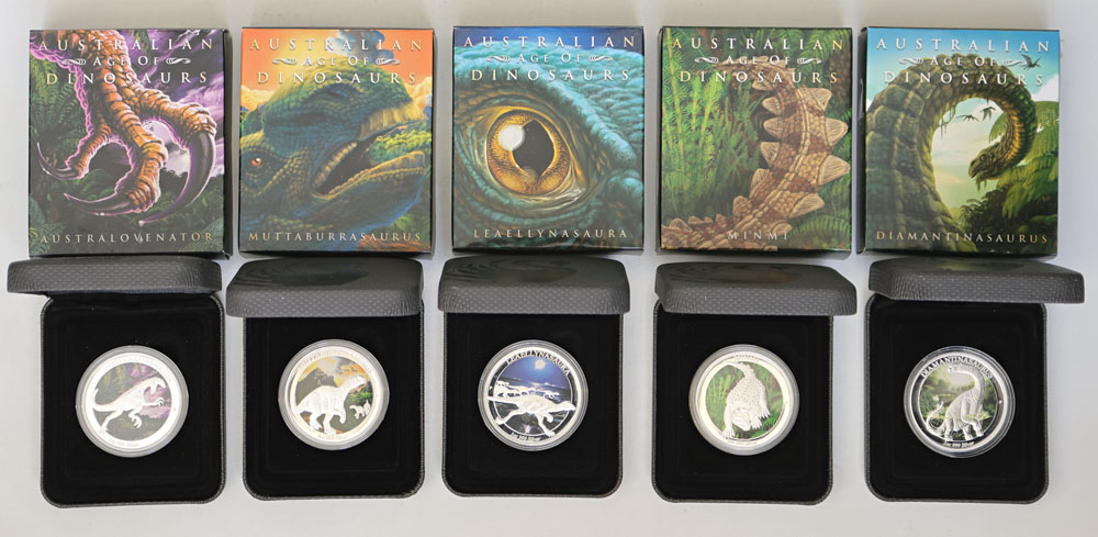 2014-2015 Australian Age of Dinosaurs set of 5 1 oz coloured silver Proofs. In boxes of issue with COA. (5 items total).