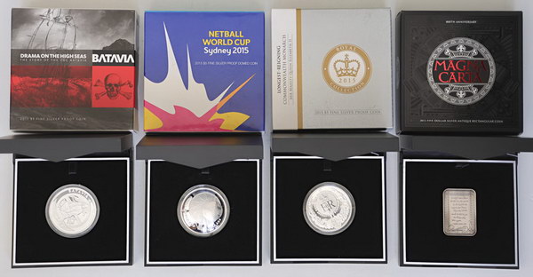 | Description: 2015 Batavia, Netball World Cup, Longest-reigning Monarch and rectangular Magna Carta 1 oz silver Proofs. In boxes of issue with COA. (4 items total). FDC |