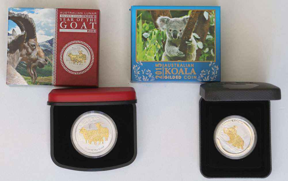 2015 Lunar Goat gilded and Australian Koala gilded 1 oz silver Proofs. In boxes of issue with COA. (2 items total).