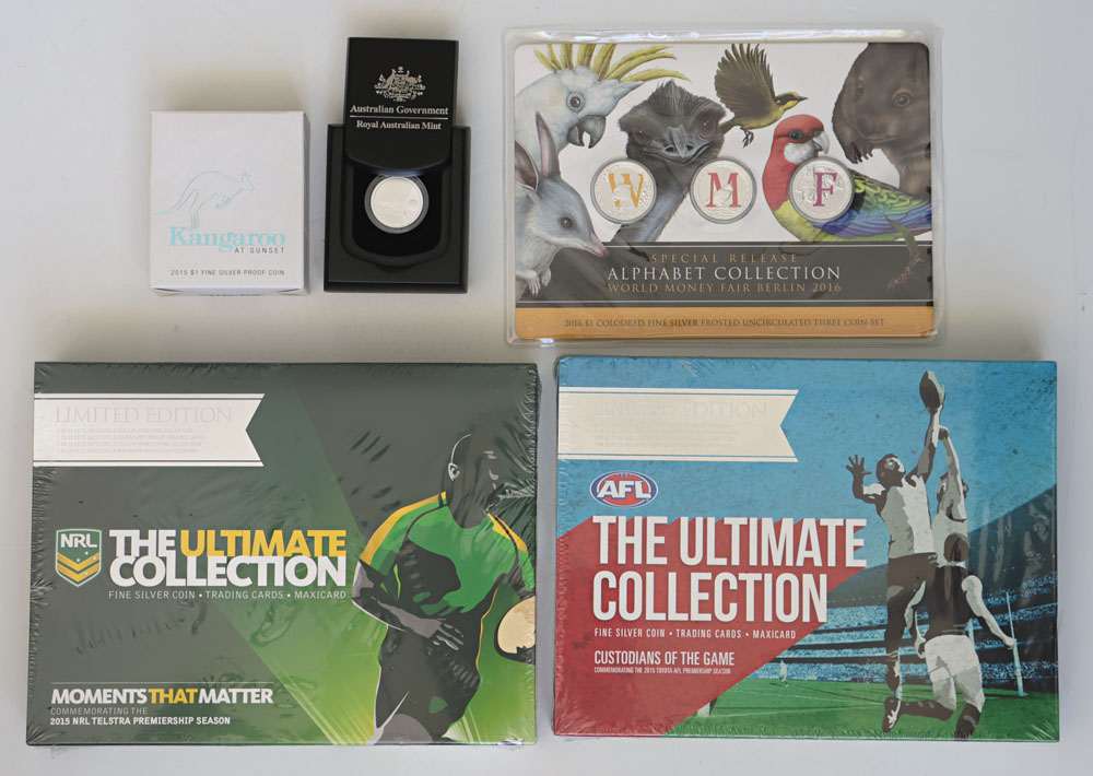 | Description: 2015 NRL Ultimate Collection, 2015 AFL Ultimate Collection, each with a silver Dollar and cards. In sealed boxes of issue. Also 2015 Kangaroo at Sunset silver Proof Dollar and World Money Fair Alphabet Collection with W, M, F coloured silver Unc Dollars. (4 items total). UNC-FDC |