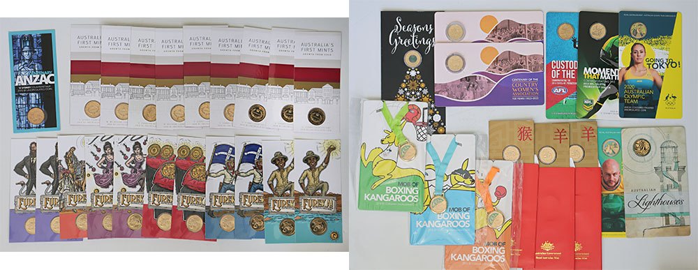 | Description: Assorted RAM carded 1 Dollars: 2015 Lighthouses, NRL Moments, AFL Custodians, Lunar Goat (2), Anzac (S), 2016 Growth From Gold (M, C, B, Sx6), Boxing Kangaroo coloured in medal frame (3), Lunar Monkey, 2020 Eureka (P, Cx10 assorted), 2020 Tokyo Paralympics coloured (2), 2022 CWA (2). Also 2020 Donation Dollar in Downies xmas card. High catalogue value. (35 coins total). UNC |
