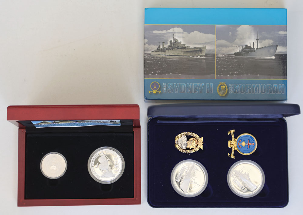 | Description: 2008 HMAS Sydney/HSK-8 Kormoran 1 oz silver Proof coin and medallion with replica miniature badges set and RAM 2006 Australia/Netherlands Duyfken 2-coin set of silver Proof 5 Euro and 5 Dollar. In box/case of issue with COA Marks to latter slipcase). (2 items total). FDC |
