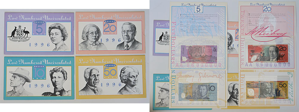 1996 Deluxe set of 4; 5, 10, 20 and 50 Dollar note with matching black serials. In folders of issue. High catalogue value. (4 items total).