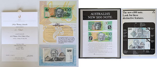 | Description: 1996 First and Last Fraser-Evans paper/polymer folder with low-numbered, matching FIRST prefix serials; 1996 dated AA96 001234 and 1984 paper ZAA 001234 (standard folders had ZLD Last paper prefix). Signed inside by Bruce Stewart -To my dear friend Alan, Same serials, 15 May 1996-. Also includes an invitation to A Flint to the NPA launch of the Polymer Note Collector Series and advertising boards for the two issues in 1984 and 1996. Ex Downies March 2019 S330, Lot 1001. An interesting and scarce lot. UNC |
