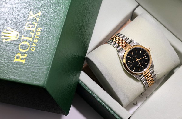| Description: R0LEX Oyster Perpetual gents watch 34mm (1989 model 14233), with 18ct gold and stainless steel Jubilee bracelet band and black face. Includes an extra link and original box. Serviced in 2015 and 2020 (receipts included). Excellent condition. |