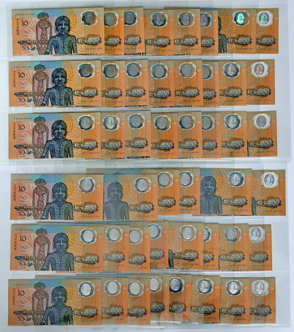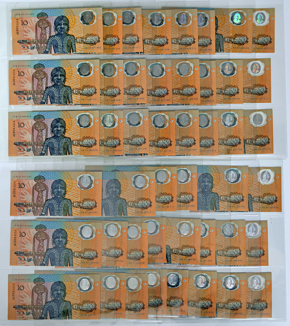 | Description: 1988 polymer Johnston-Fraser AB 10 - AB 57 (R 310b, 310bF, 310bL). Set of 47 prefixes (only missing AB 37 and AB 49). All Re-Issues, including First Reissue prefix AB10 and scarce Last Re-issue prefix AB57. All Unc except AB50 and AB53. In note album. Catalogues at $5,450. (47 notes total). UNC |