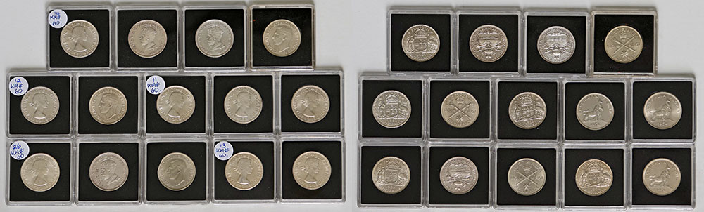 | Description: 1927 Canberra (3; one with date inscribed on Obv), 1951 Federation (3), 1954 Royal Visit (3), 1957, 1960, 1962 (2), 1963. (14 coins total). aVF-UNC |