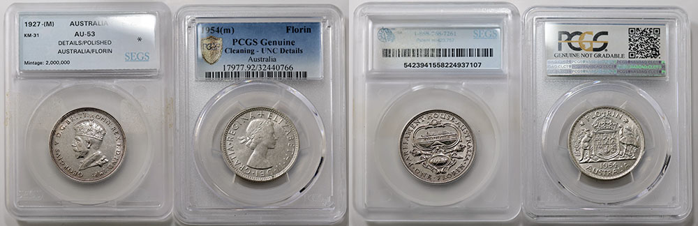 | Description: 1927 Canberra, 1954. First SEGS graded AU53 Details- polished, second PCGS graded Genuine Unc Details -Cleaning (32440766). (2 coins total). gVF-aUNC |