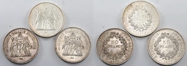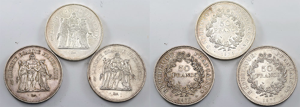 France 50 Francs 1975, 1977 (2). Republic. One toned. (3 coins total).
