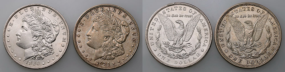 United States silver Morgan Dollars: 1886, 1921D. (2 coins total).