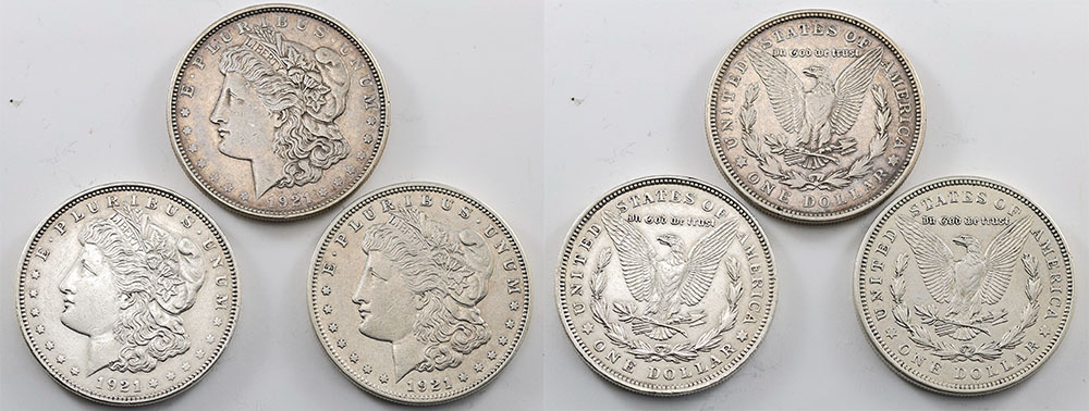 United States silver Morgan Dollars: 1921 (2), 1921D. (3 coins total).